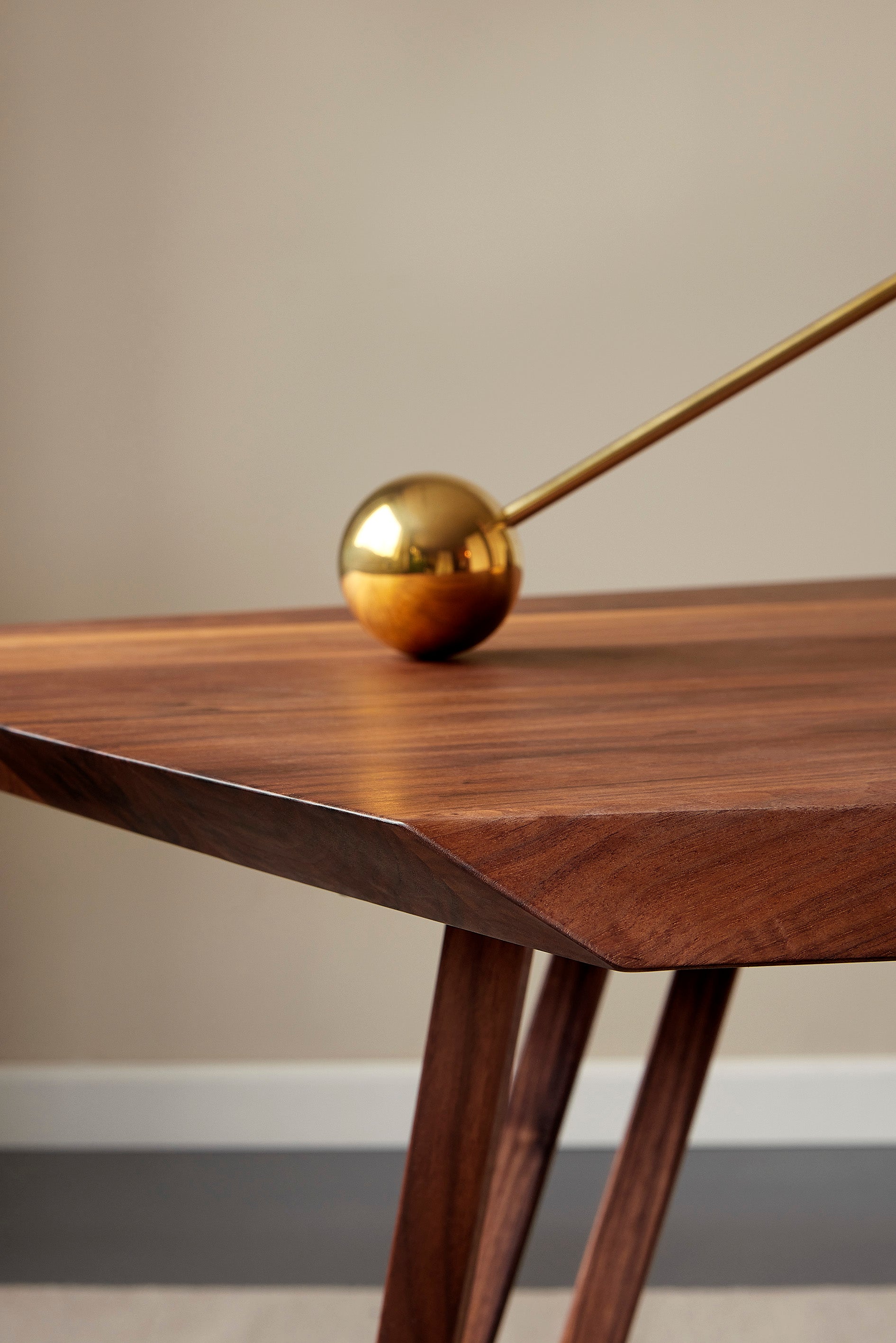 Die Tischplatte des Esstisches von Noyer ist achteckig, und die Kanten sind in entgegengesetzten Winkeln von 45 Grad geschnitten. Bei der Montage der breiten Planken liegt der Fokus darauf, eine harmonische Tischplatte zu schaffen, die gleichzeitig das charakteristische Spiel des Nussbaumholzes betont, welches seine größte Stärke ist – neben seiner Fähigkeit, durch Gebrauch noch schöner zu werden.