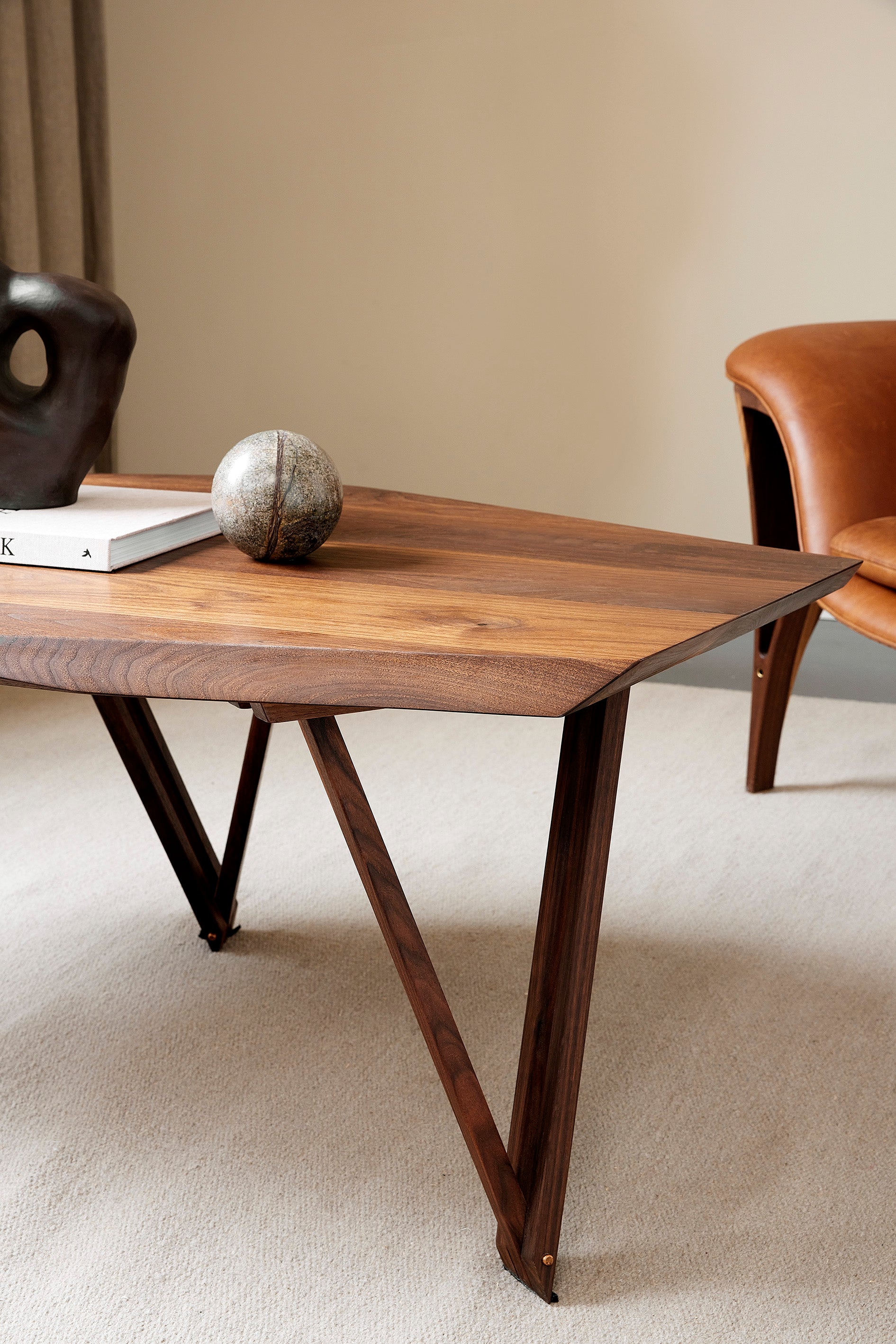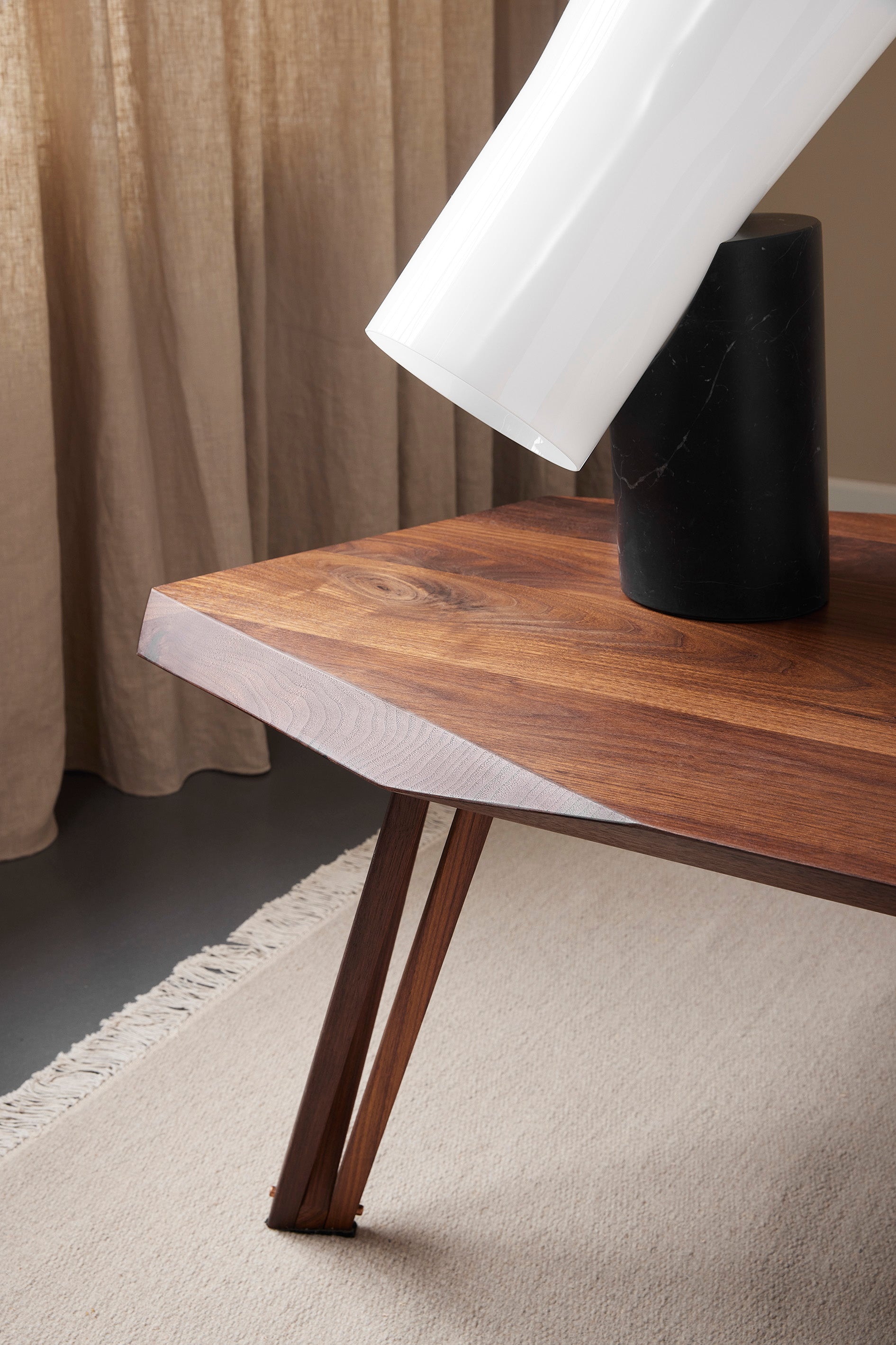 Le gambe, appositamente progettate, sono realizzate in noce con dettagli in rame, e ogni singola gamba è una piccola opera d’arte artigianale, caratterizzata da precisione e angoli inusuali. Oltre al valore estetico, il design particolare di queste gambe è anche la chiave del funzionamento del tavolo a tre gambe.